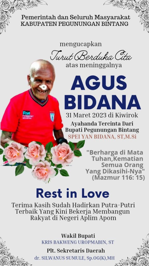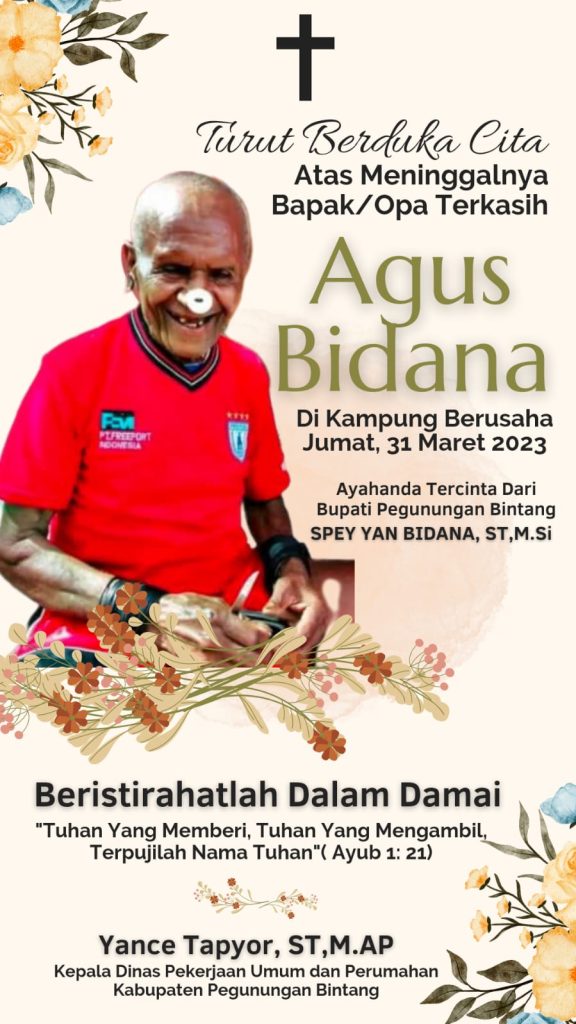 Kabar duka itu beredar sejak Jumat, 31 Maret 2023 malam dalam sejumlah WhatsApp (WA) Group. Ayahanda Bupati Spei, Agus Bidana, meninggal di hari itu tepat Pkl. 14.00 di Kampung Berusaha, Distrik Kiwirok.