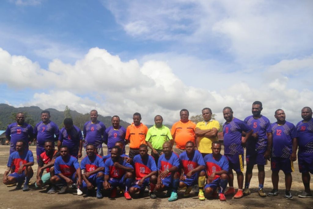 Para pemain sepak bola yang siap melakoni pertandingan eksebisi mengawali turnamen HUT Kabupaten Pegubin yang dibuka Bupati Spei Bidana. Jumat, 10 Maret 2023. Para pemain adalah dari kepala OPD, kepala distrik, dan TNI/Polri.